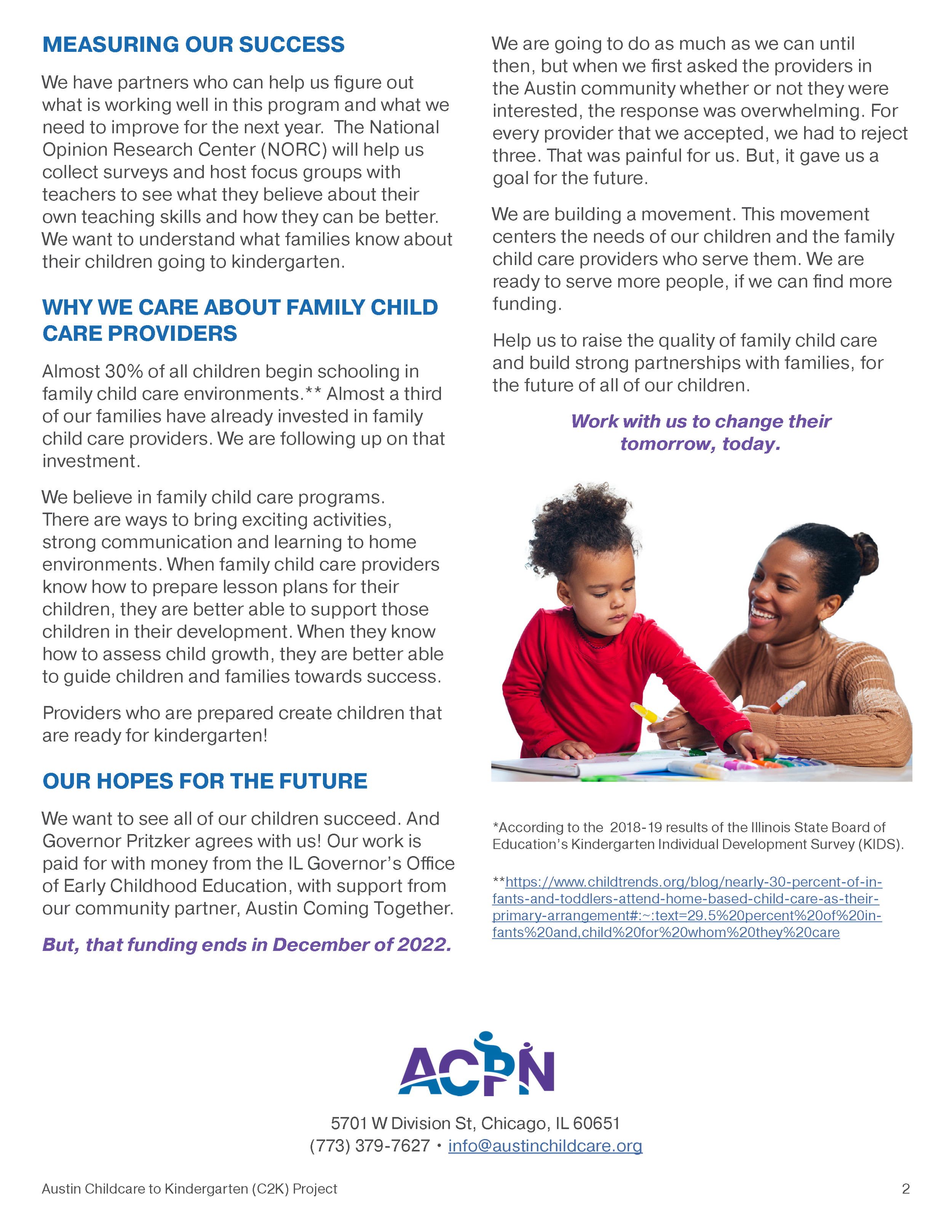 Designed a two-page handout for the Austin Childcare Providers Network (ACPN), a nonprofit organization based in Chicago that supports early childcare providers and connects them with resources to help secure additional funding.